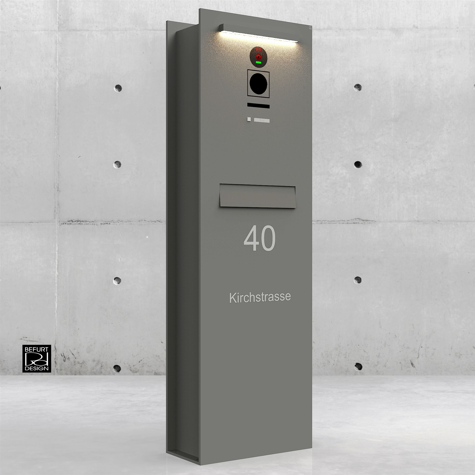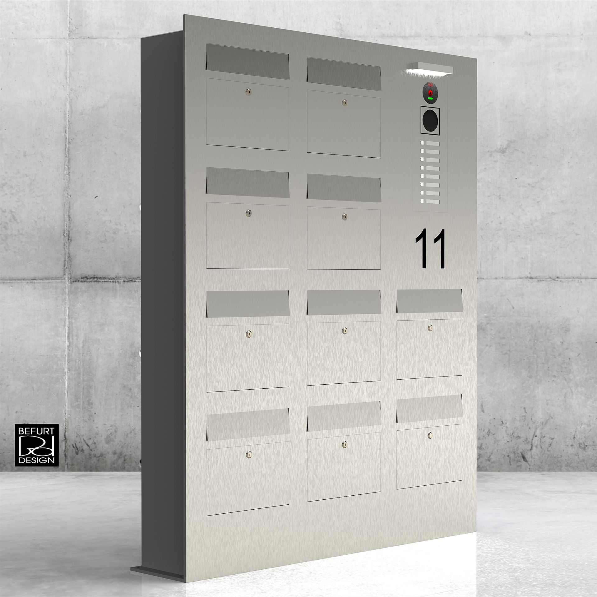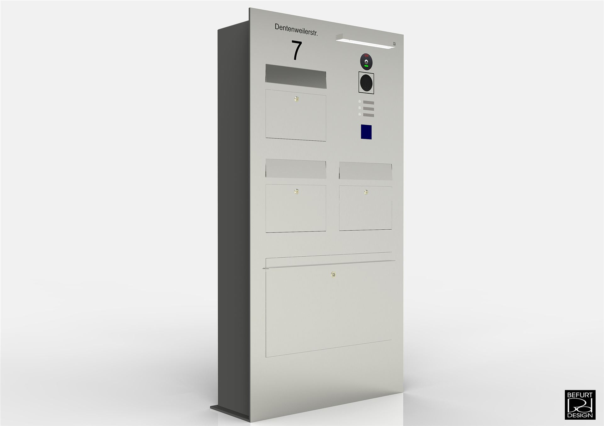 | standbriefkasten " ACERO stand10 c-talk" aus edelstahl und aluminium mit spezialleuchte. postentnahme vorne. 10 klingelknöpfe mit graviertem namensschild, 10 touchscreen monitore 7", kamera und sprechmodul. maße: h=1850mm b=1350mm t=270mm. | freistehender briefkasten "ACERO stand c-talk" aus edelstahl und aluminium komplett lackiert DB 703 eisenglimmer. inkl. spezialleuchte, sprechfeld, klingelknopf und graviertem namensschild und videosprechanlage mit 7" touchscreen monitor. postentnahme rückseitig. maße: ca. h=1700mm b=500mm t=270mm | standbriefkasten "ACERO c-talk" aus edelstahl und aluminium. videosprechanlage inkl. 1 touchscreen monitor, klingelknopf mit graviertem namensschild, paketfach mit drehknauf und spezialleuchte. maße: ca h=1610mm b=495mm t=240mm. OPTION: paketbox elektrisch mit code-tastatur gegen aufpreis | standbriefkasten " ACERO stand6 c-talk" aus edelstahl und aluminium mit spezialleuchte. postentnahme vorne. 6 klingelknöpfe mit graviertem namensschild, 6 touchscreen monitore 7", kamera und sprechmodul. maße: h=1850mm b=920mm t=270mm. | standbriefkasten-wegweiser "ACERO Stand c-talk wegweiser" frontplatte und rückseite aus edelstahl gebürstet, sprechfeld, edelstahlleuchte und 3 klingelknöpfe mit gravierte namensschilder. korpus aus aluminium lackiert DB 703 eisenglimmer. frontentnahme und revisionsöffnung für elektrik auf rückseite. gegensprechanlage bauseits. maße ca. h=1990mm x b=870mm x t=270mm |