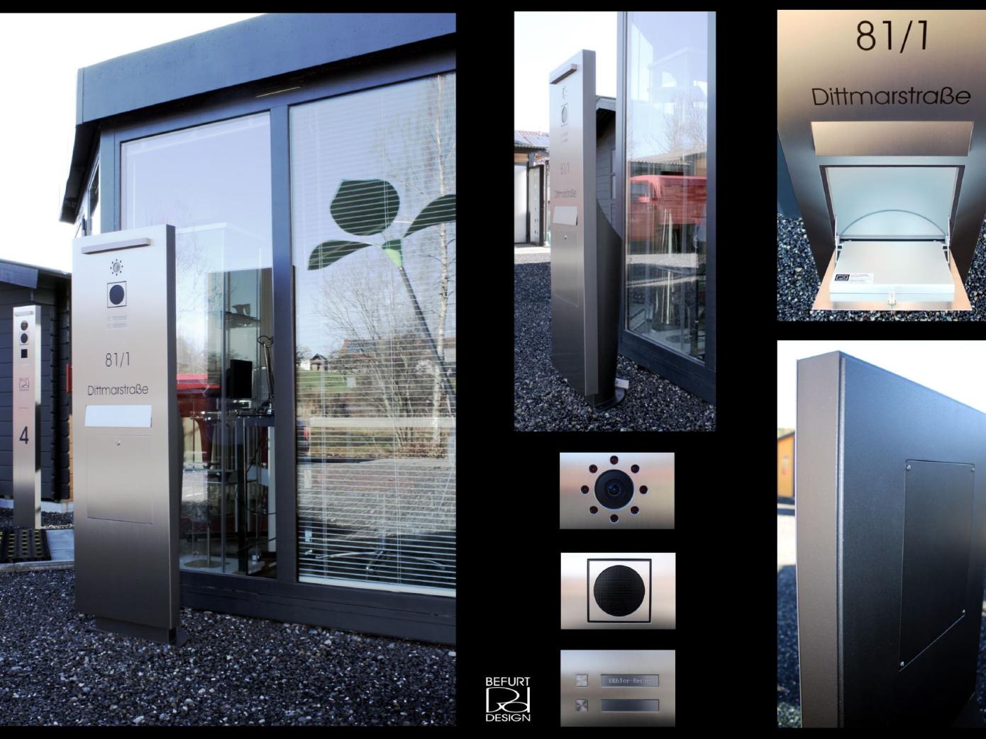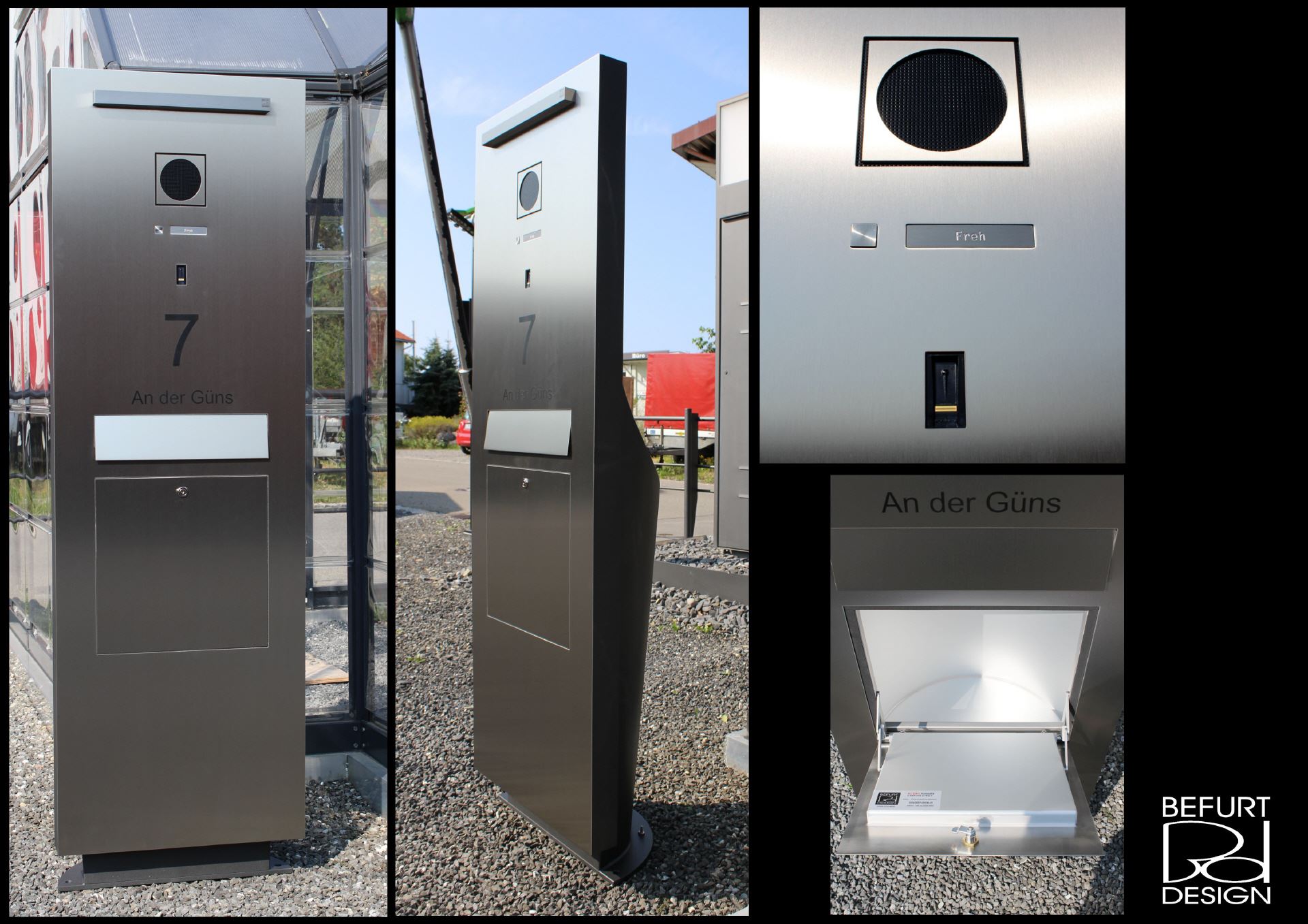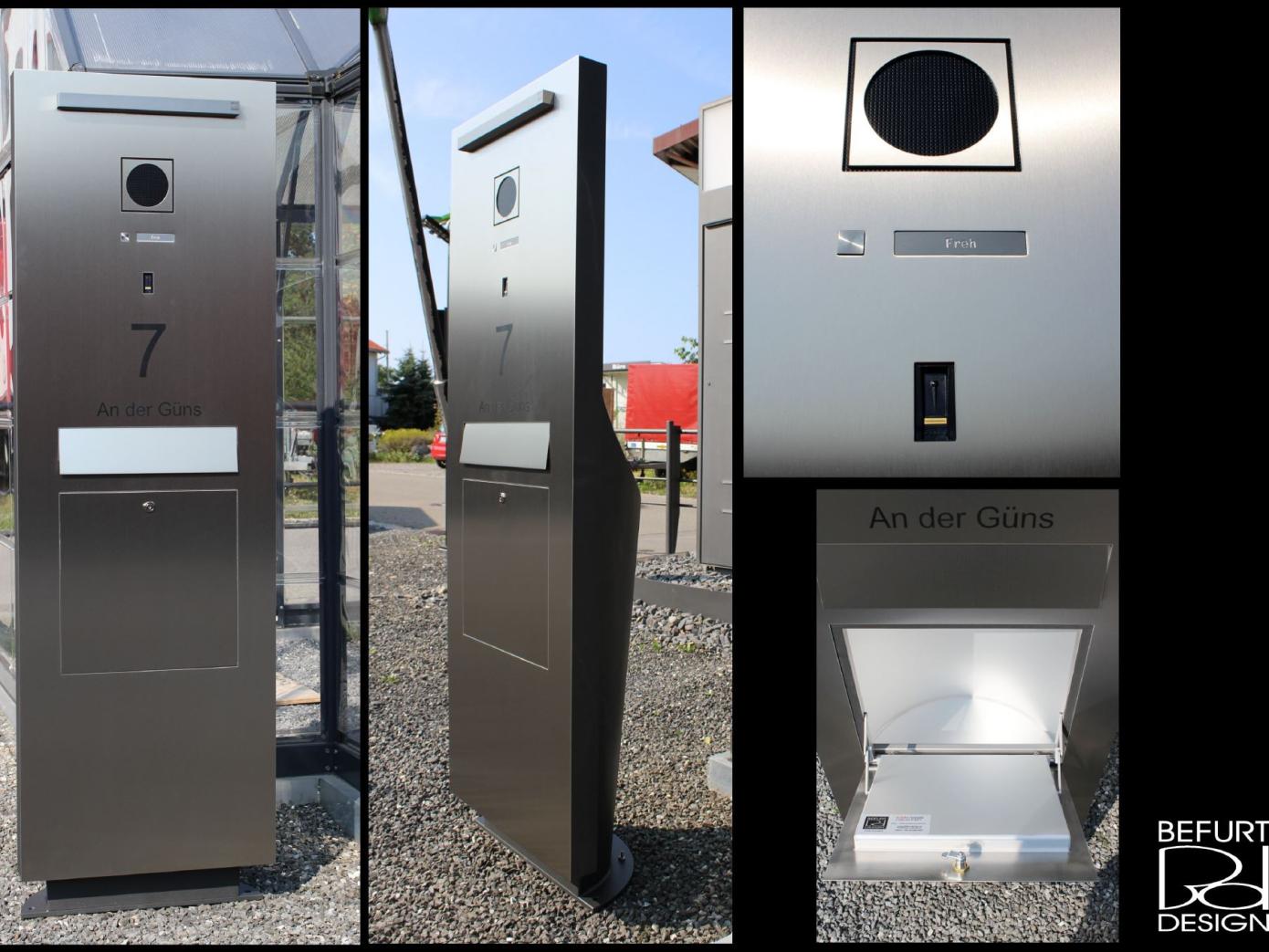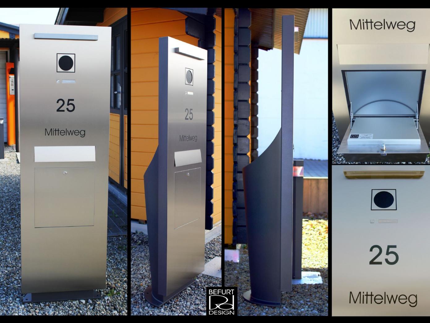 ein aussergewöhnlicher standbriefkasten aus edelstahl und aluminium.